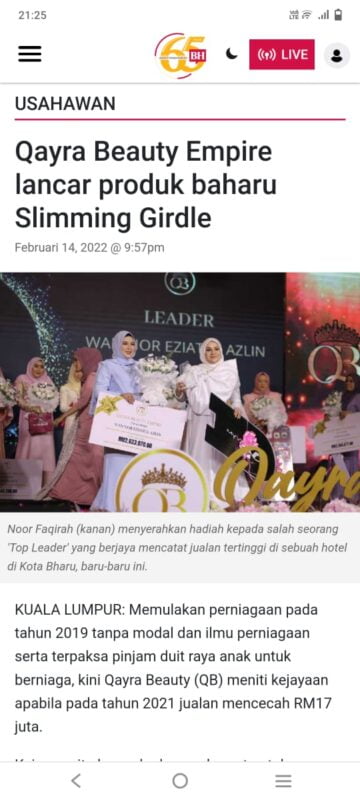 Memulakan perniagaan pada tahun 2019 tanpa modal dan ilmu perniagaan serta terpaksa pinjam duit raya anak untuk berniaga, kini Qayra Beauty (QB) meniti kejayaan apabila pada tahun 2021 jualan mencecah RM17 juta.